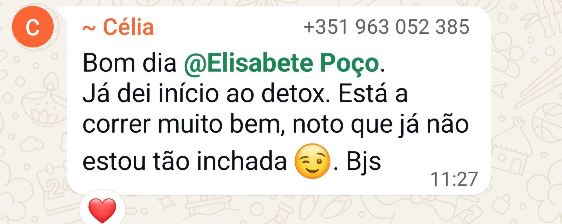 Em primeiro lugar, quero felicitá-la pelo EXCELENTE Desafio Detox. Só agora percebi o motivo de ter fome à noite e, depois do almoço, parece que sinto falta de qualquer coisa para ficar satisfeita. Percebi a importância da proteína. MUITO OBRIGADA."